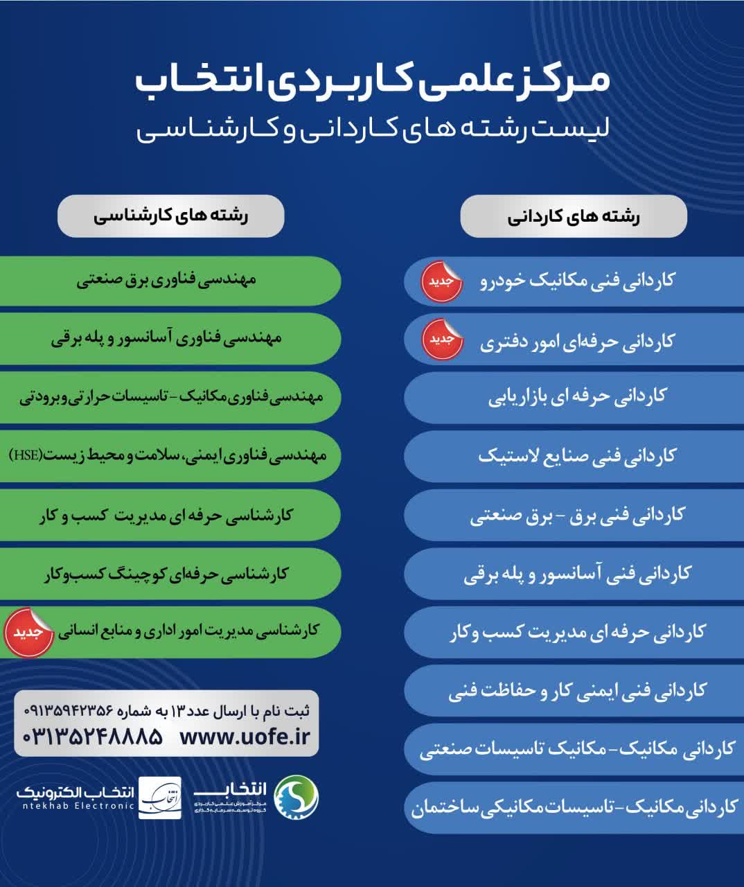 داوطلبین تحصیل در دانشگاه جامع علمی کاربردی می توانند جهت ثبت نام نیمسال بهمن 1404 در رشته های زیر به مرکز آموزش علمی کاربردی گروه انتخاب مراجعه فرمایند: